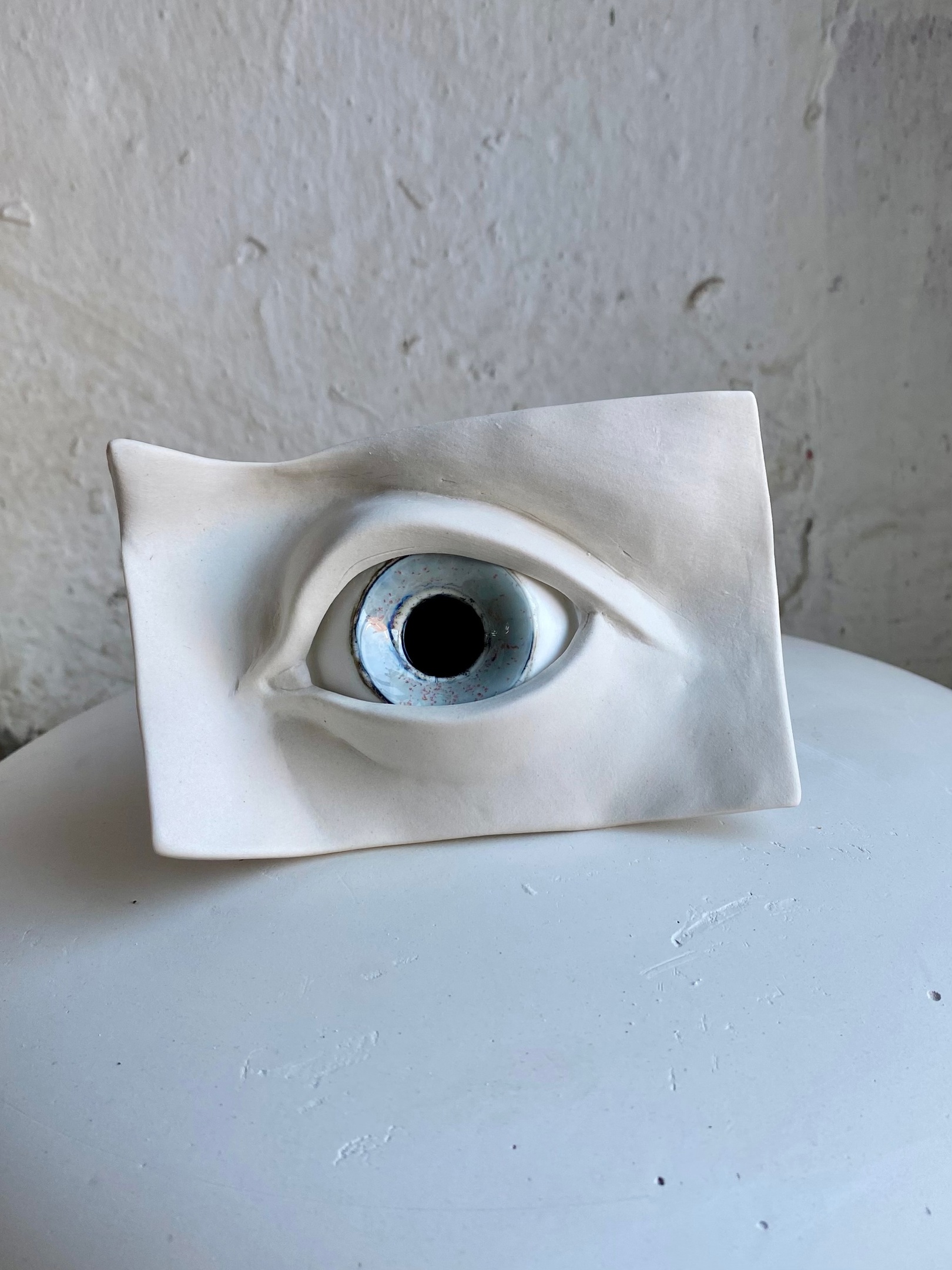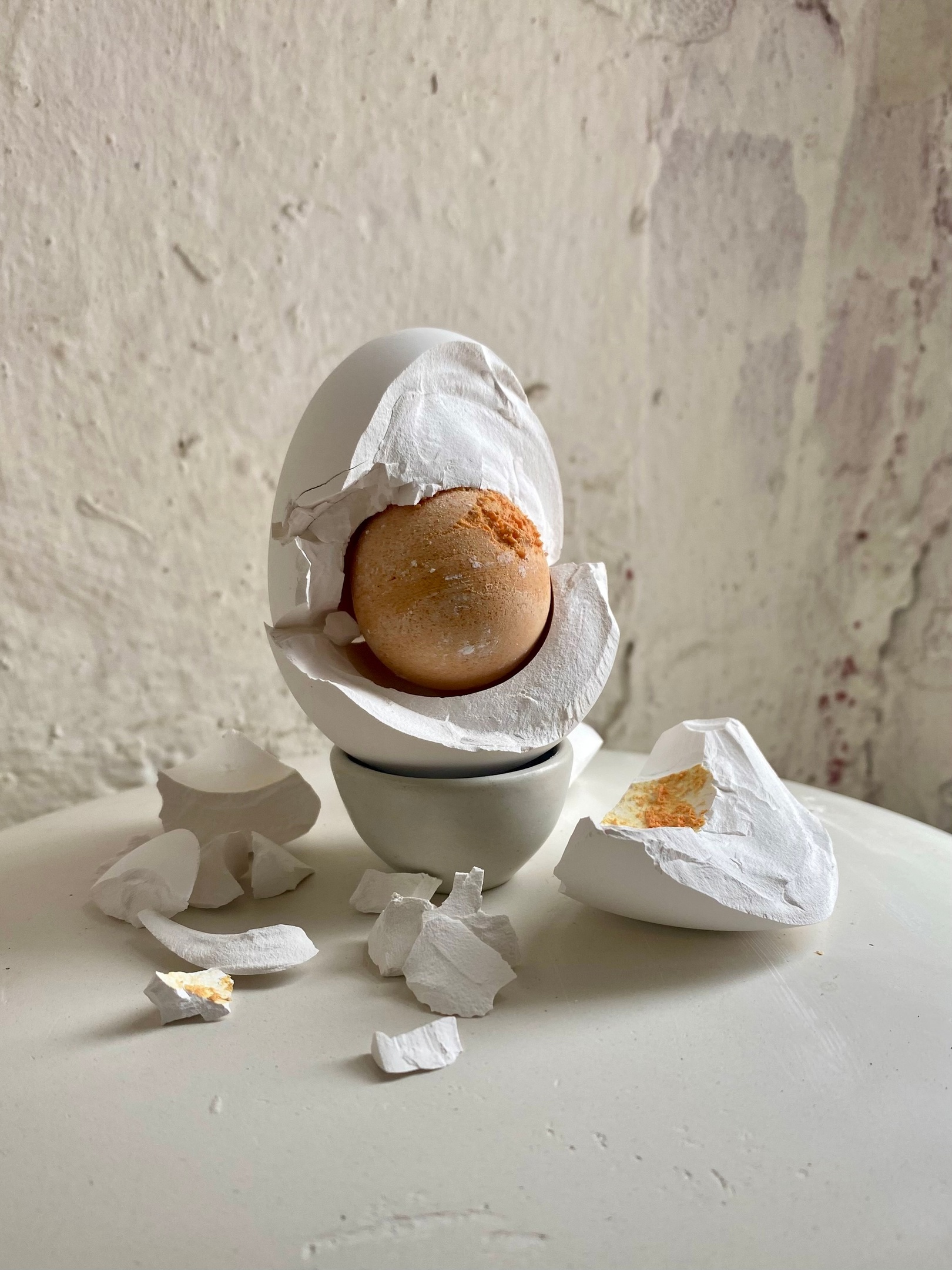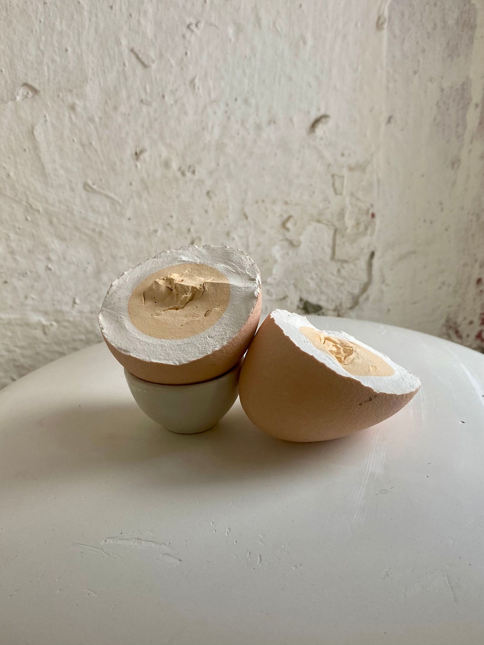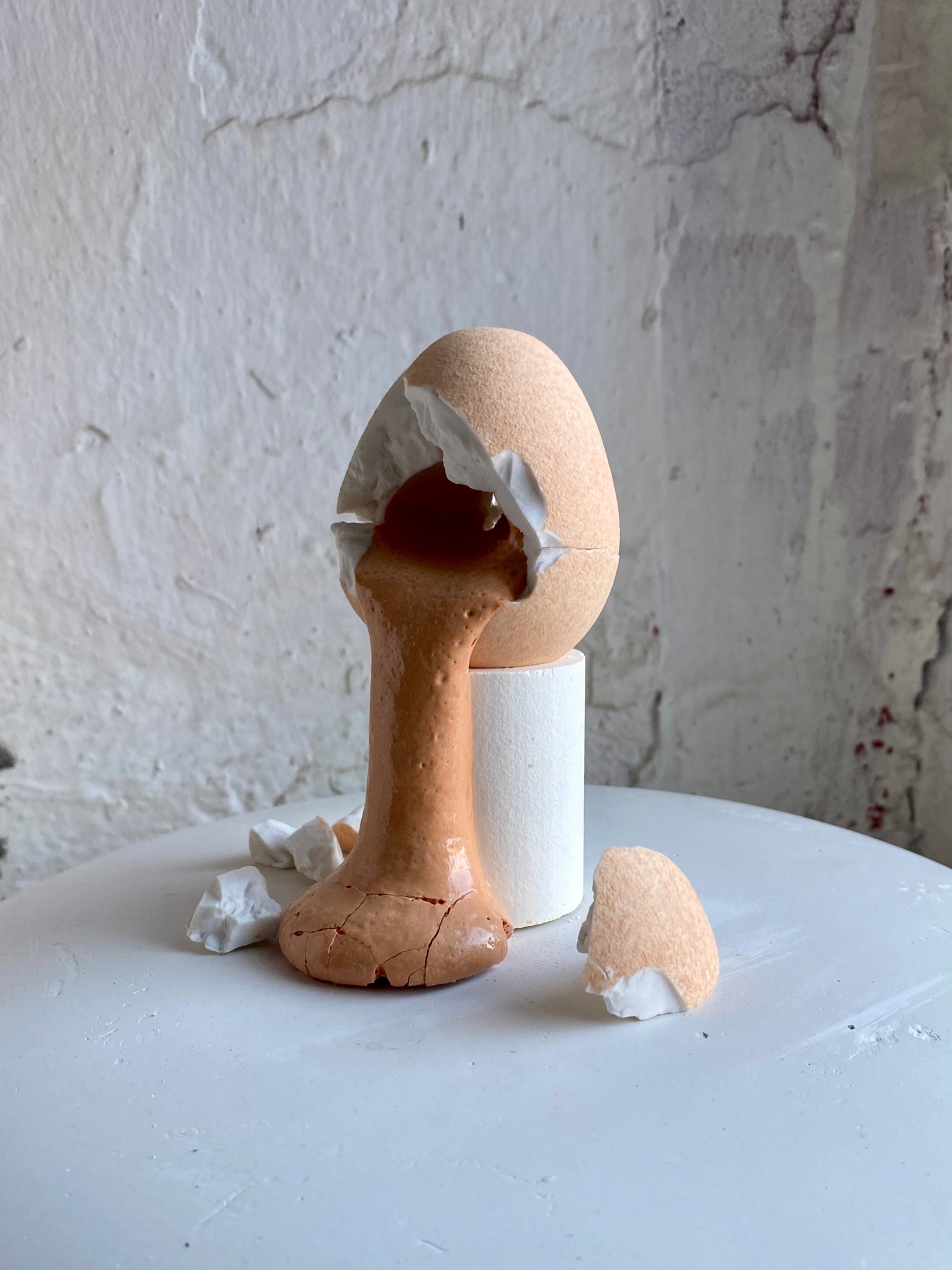 Сначала была утельная стадия этого яйца. Я его разбивал, чтобы была фактура. А после политого обжига желток потек.