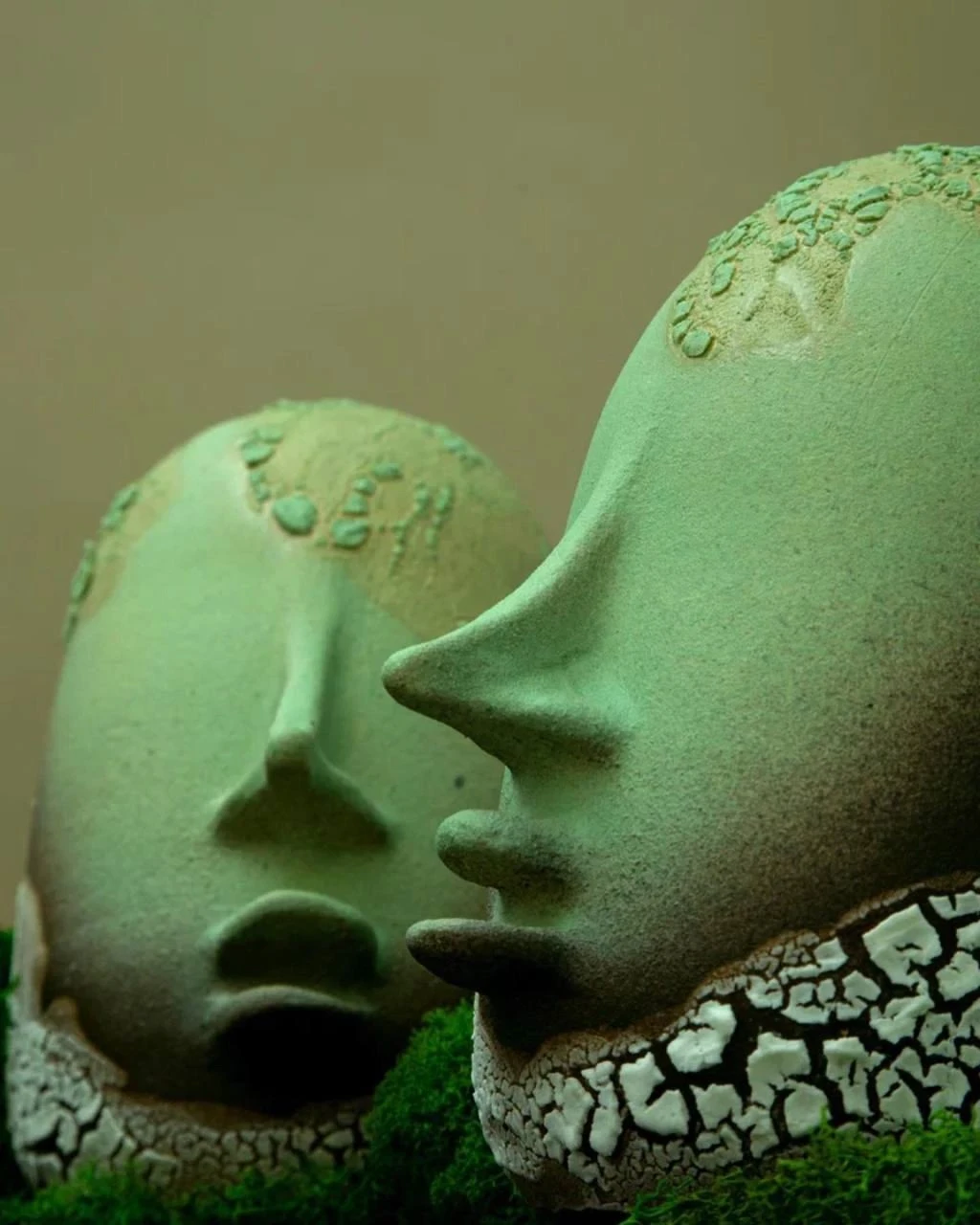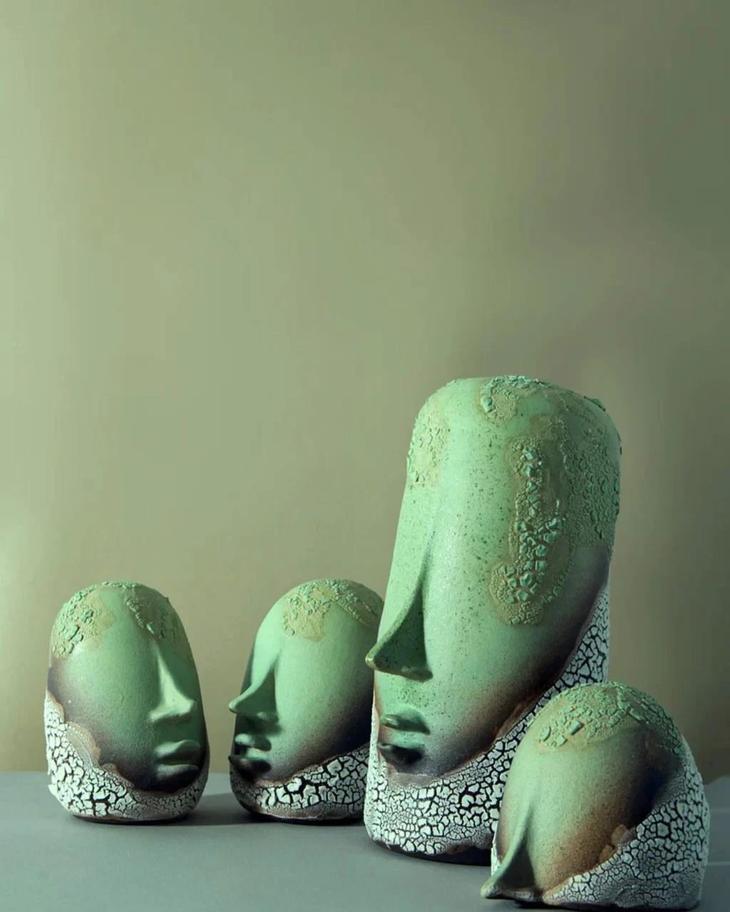 Сделаны они из черной массы на гончарном круге, покрыто напылением из аэрографа ангобами. А также две сборки белая и зеленая от OVO. Здесь так прекрасно все сложилось, что ангоб и сборка попали в тон и получилось, что родился один зеленый прекрасный цвет.