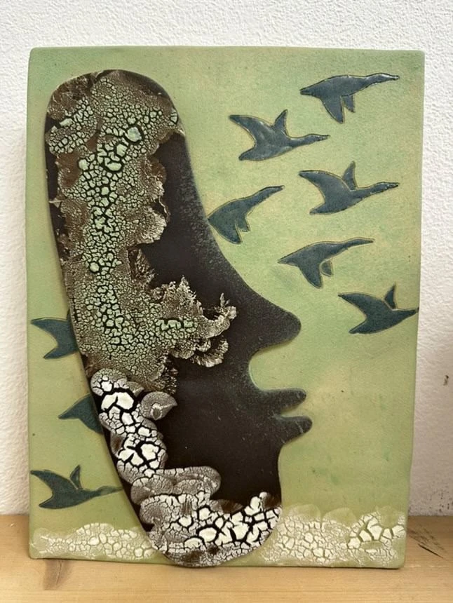 Идея, честно говоря, была до этого. И вообще вот эта форма с лицами, с людьми прослеживается в работах. У меня есть такая серия человечков небольших в различных форматах. Это просто история, которая у меня развивается, какая-то моя внутренняя тема с человечками, которая сейчас вылилась в нечто такое с лицами. И есть из этой же серии вот такая история (фото ниже), это они же только плоские. Это работа с последнего обжига в дровяной печи. То есть какая-то человечная история где-то пару лет назад появилась и с тех пор сквозит в творчестве.