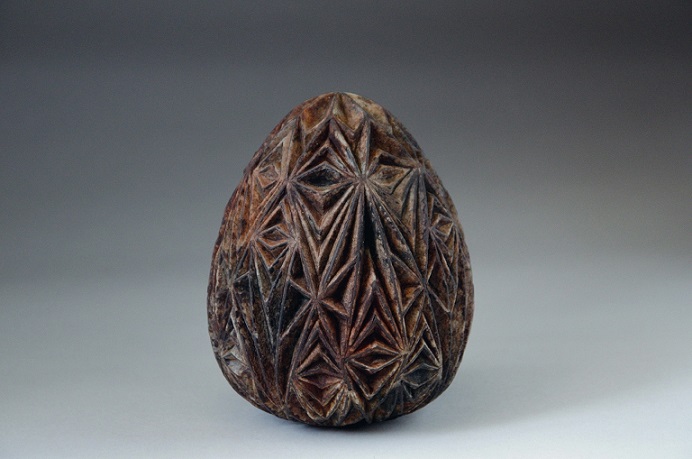 Яйцо сделано из смеси Дивеевской глины и Никодима, покрыто фарфором и солями металлов. Как и другие мои работы, яйцо создавалось в технике карвинга по сухой глине. В привычном понимании карвинг происходит по кожетвёрдому состоянию глины, когда она уже достаточно плотная, чтобы рисунок не смазывался, но ещё не высохла и из-за этого рельеф легко повредить. Мои узоры — это треугольно-ромбовидные мотивы с острыми гранями. Чтобы рисунок получился чётким, карвинг по кожетвёрдой глине не подходит, поэтому я вырезаю, или, вернее сказать, выцарапываю узоры по сухой глине с помощью канцелярского скальпеля или крошечного ножичка из карбида-вольфрама.