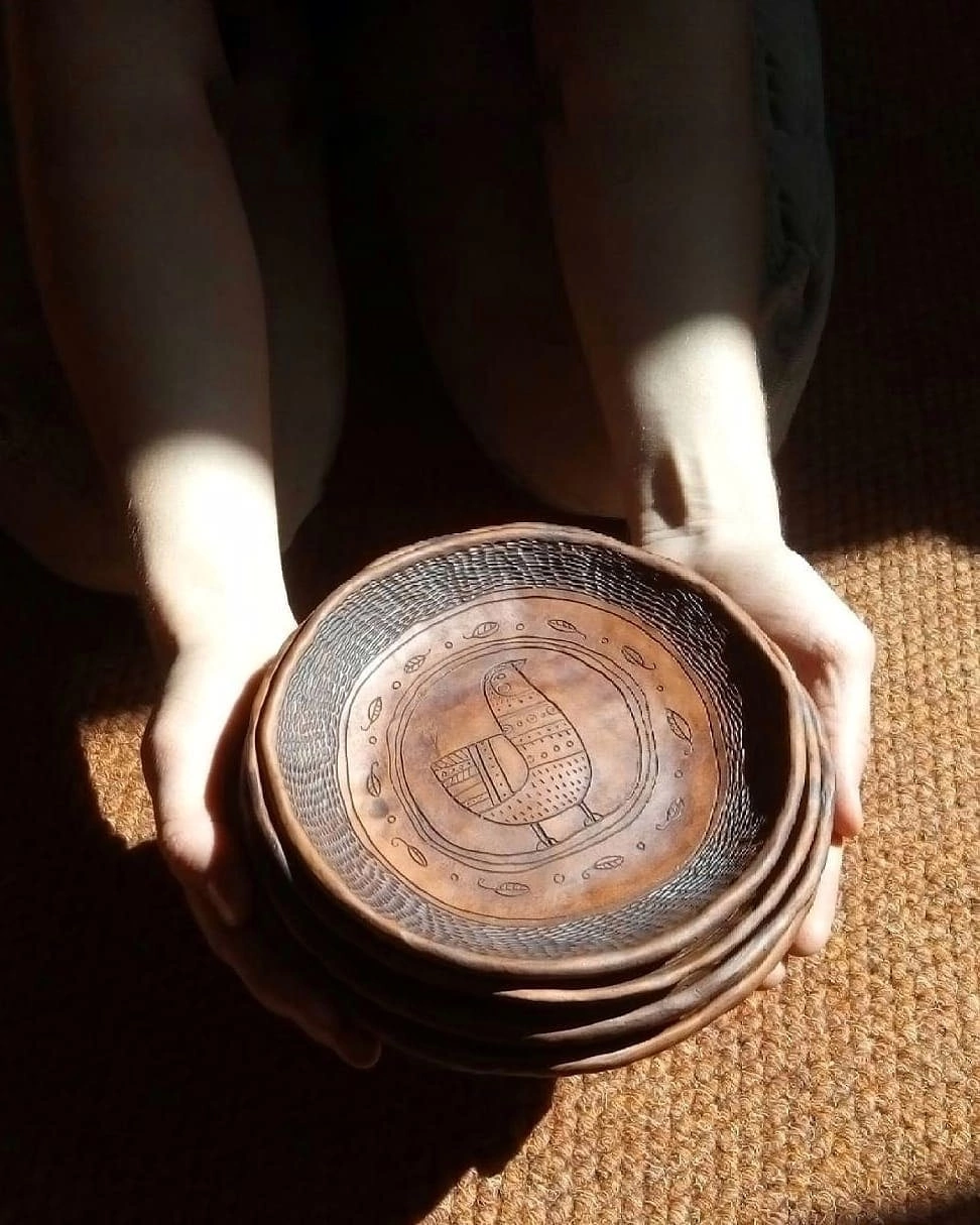 Во-вторых, это быстро и дешево. Не нужно наводить глазури, нет опасности плохо нанести и получить брак, обжиг длится 3-4 часа, а пакет молока стоит 100 рублей. С помощью этой техники легко получить изделия, выделяющиеся среди глазурованной керамики своим условно “народным” стилем, гармоничные и легко компонуемые в комплекты благодаря единству цвета и фактуры.