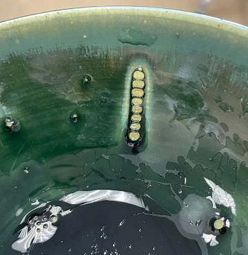 - Пузыри возникают только там, где наслаиваются разные глазури? Вероятно, эти глазури не сочетаются, соединение их компонентов приводит к эффекту эвтектики.